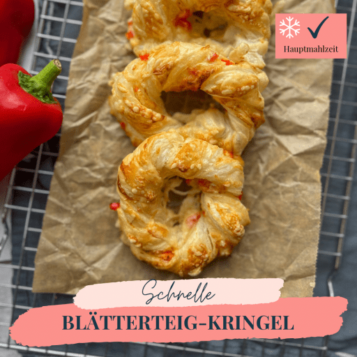 Zunächst den Backofen auf 200 °C Umluft vorheizen und ein Backblech mit Backpapier auslegen. Den Blätterteig ausrollen und mit Frischkäse und Salz und Pfeffer bestreichen. Dann den Teig mit Paprika und Käse darüberstreuen. Den zweiten Blätterteig auf die erste Schicht legen und gut andrücken. Anschließend den Blätterteig in 4-5 cm dicke Streifen schneiden. Diese Streifen dann jeweils am rechten und linken Ende festhalten und so drehen, dass der Streifen die Form einer Spirale hat. Jede Spirale zu einem Kreis formen und die Enden aneinander drücken. Die Blätterteig-Kringel auf ein Backblech legen. Das Eigelb mit etwas Milch verquirlen, die Kringel damit bestreichen und mit dem Käse bestreuen. Dann das Blech für 15 bis 20 Minuten in den Ofen geben, bis die Kringel goldbraun gebacken sind. Alternativen: Schinkenwürfel mit Käse, Pizzasoße mit beliebigen Zutaten und Käse, mit Pesto bestreichen, Pinienkerne und Parmesan darüber streuen, Schokomus oder MarmeladeBlätterteig-Kringel