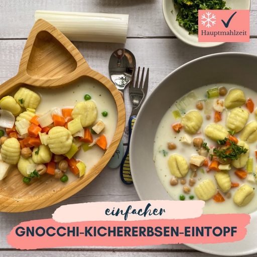 Der kleine Räuber ist gerne Kartoffeln, Möhren und Erbsen im Eintopf. Aber heute habe ich die Kartoffeln durch Gnocchis ersetzt und einfach noch Kichererbsen und Lauch hinzugefügt.