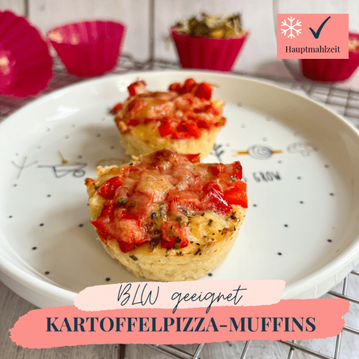 Kartoffeln und Kohlrabi in einem Topf mit Salzwasser 20 Minuten gar kochen. Den Backofen auf 200 Grad (Ober-/Unterhitze) vorheizen. Die Kartoffeln und Kohlrabi abgießen und mit einem Kartoffelstampfer zerdrücken. Ggf. mit Salz oder auch Kräuter würzen. Das Mehl, die Eier und das Backpulver unter die Kartoffelmasse heben und vermengen. Die Muffinform bei Bedarf einfetten (bei Silikon nicht notwendig). Dann mit Öl beträufeln und die Kräuter darüber streuen. Zum Schluss die #pizza mit Gemüse und Käse belegen. Nun kommt die Pizza für etwa 25-30 Minuten in den Backofen. 🚼Die Kartoffelpizza ist mit Beikosterfahrung gut geeignet.Kartoffelpizza-Muffins