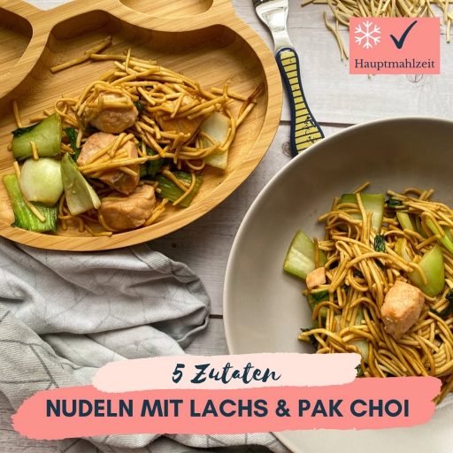 Die Wok Nudeln gemäß der Packungsanleitung zubereiten. Sesamöl in einer Pfanne erhitzen und den Pak Choi darin von allen Seiten anbraten. Den geriebenen Ingwer dazugeben und mit braten. Die fertigen Nudeln sowie den Lachs dazugeben und zuguckt bei kleiner Hitze 3 Minuten ziehen lassen, bis der Lachs fertig ist. Das ganze noch mit etwas Sojasauce abschmecken. Die Wok Nudeln können auch durch Glasnudeln oder Mie-Nudeln ersetzt werden.Nudeln mit Lachs & Pak Choi