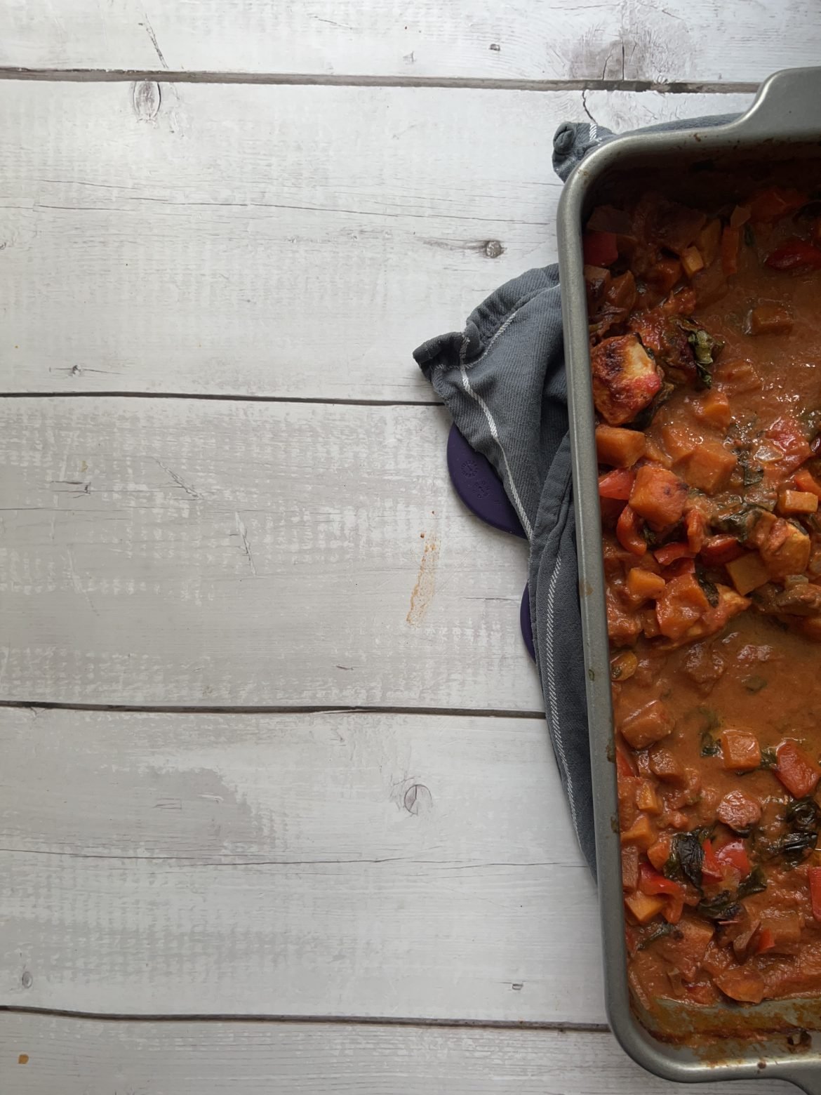 Das Gemüse, das Fleisch und die Gewürze in deine Auflaufform geben und verteilen. Dann die Flüssigkeit hinzufügen und alles mit einander verrühren. Das Süßkartoffelgulasch nun für 60-70 Minuten bei 225°C Ober-/Unterhitze backen, bis die Süßkartoffeln gar sind.Süßkartoffel-Gulasch