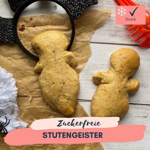 Milch zusammen mit der gewürfelten Butter in einem kleinen Topf erwärmen, bis die Butter geschmolzen ist. Lauwarm abkühlen lassen und die Hefe einrühren. Mehl mit Dattelmus und Salz vermischen. Eier und Milch einrühren und dann mit der Küchenmaschine kräftig, mehrere Minuten, zu einem glatten Teig verkneten. Teig an einem warmen, zugfreien Ort (z.B. im Backofen bei 40°C), abgedeckt 40 Minuten gehen lassen. Teig nochmals durchkneten. Backofen auf 170°C Ober-/Unterhitze vorheizen. Teig in gleichgroße Stücke teilen. Die Backbleche mit Backpapier belegen und Geister direkt darauf formen. Aus jedem Stück ein flaches Oval drücken. Teigovale wie auf dem Foto einschneiden, damit Kopf und Arme entstehen. Kleine Dreiecke zwischen Kopf und Schultern entfernen. Dann runden Kopf und Arme formen, den Teig unten verdrehen, damit ein Zipfel entsteht. Rosinen als Augen als Mund in den Kopf drücken. Geist mit Milch bestreichen. Alle weiteren Geister ebenso formen. Geister nochmal etwa 20 Minuten gehen lassen. Im vorgeheizten Backofen Bleche nacheinander auf mittlerer Schiene etwa 12 Minuten backen, bis die Geister goldbraun sind.zuckerfreie Stutengeister